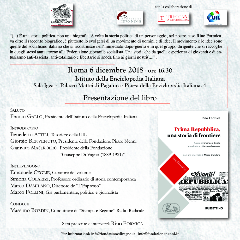 Il prossimo 6 dicembre alle ore 16,30 a Roma, all’Istituto della Enciclopedia Italiana Treccani, sala Igea, in piazza della Enciclopedia Italiana, 4 verrà presentato, su iniziativa della Fondazione Pietro Nenni assieme alla Fondazione Giuseppe Di Vagno, alla Uil e alla Treccani il libro di Rino Formica “Prima Repubblica, una storia di frontiere”.