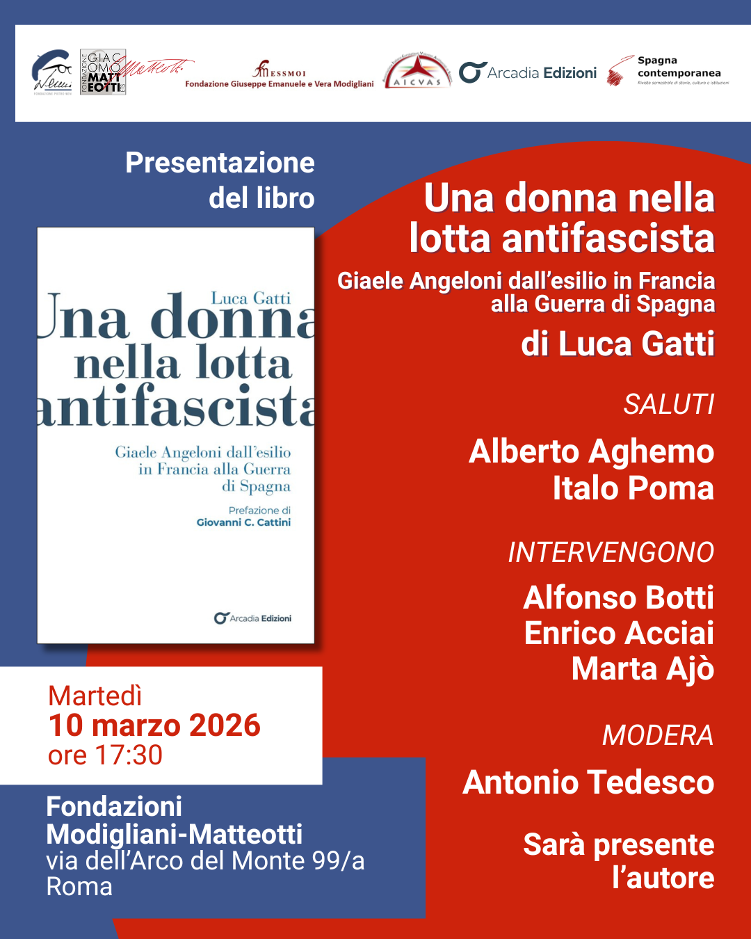 Martedì 10 marzo alle ore 17.30, presso le Fondazioni Modigliani–Matteotti in via dell’Arco del Monte 99/a a Roma, la Fondazione Nenni, insieme ad Arcadia Edizioni, Fondazione Matteotti, Fondazione Modigliani, AICVAS e alla rivista Spagna Contemporanea, promuove la presentazione del volume di Luca Gatti Una donna nella lotta antifascista. Giaele Angeloni dall’esilio in Francia alla Guerra di Spagna (Arcadia Edizioni).